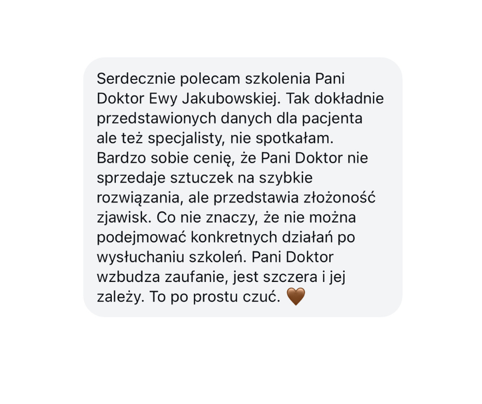 To oczywiste, że podczas 60-minutowej konsultacji nie jestem w stanie przedstawić wszystkich podstaw leżących u podłoża danego zagadnienia koncentrując na rozwiązywaniu konkretnych problemów danego Pacjenta. Dlatego czasami może być odczuwany niedosyt wiedzy.